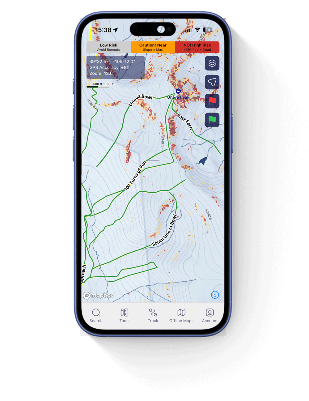 Because the shading updates with daily conditions, a route can flip from red to green (or vice versa) depending on the snowpack. Same terrain, different day, different answer.
