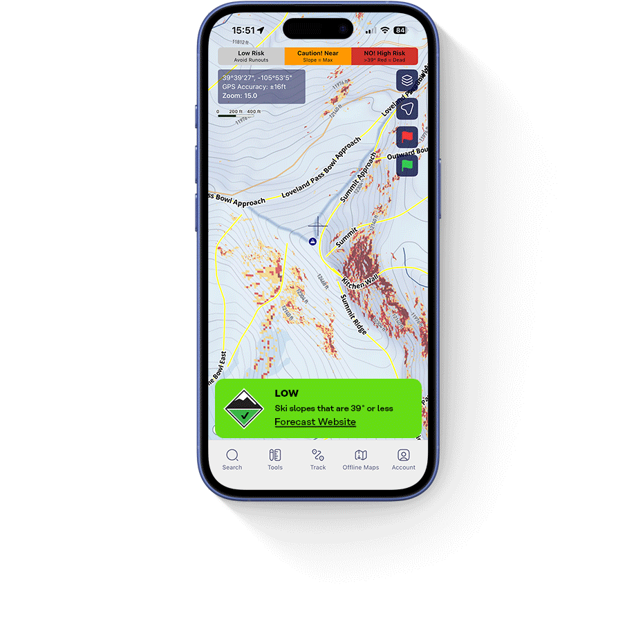Red shading = slopes that align with today’s higher-risk conditions. Clear areas = terrain unlikely to produce avalanches under the current forecast. Instead of memorizing forecasts and translating them mentally, the map visualizes them for you in real time.